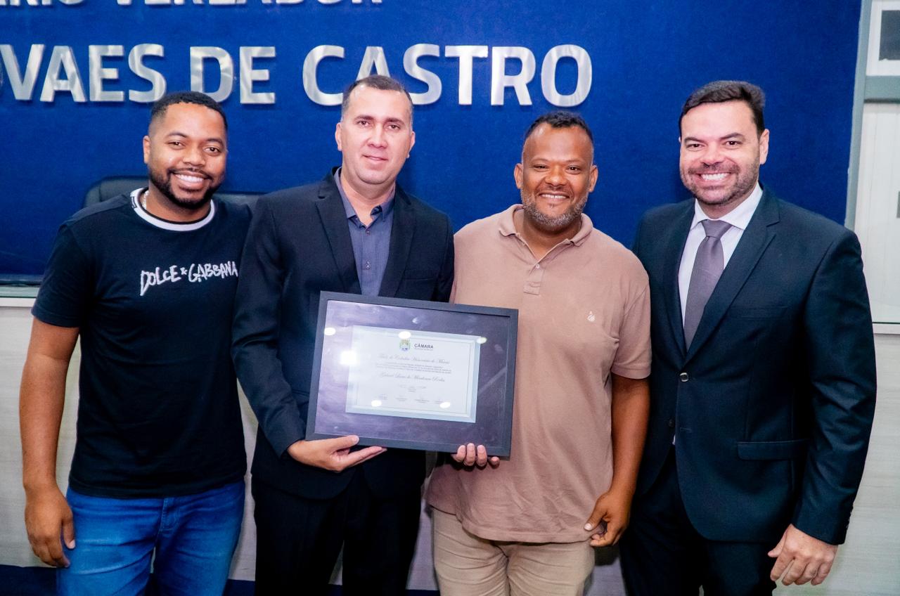 A Câmara Municipal prestou homenagem, durante sessão solene nesta quinta-feira (13), aos servidores da Secretaria Municipal de Infraestrutura (Seminfra), Gabriel Rodas, e Ivens Peixoto. Por proposição do vereador Cal Moreira, que foi aprovada por unanimidade pelos parlamentares, Gabriel recebeu o Título de Cidadão Honorário, enquanto Ivens foi agraciado com a Comenda do Mérito Cívico.